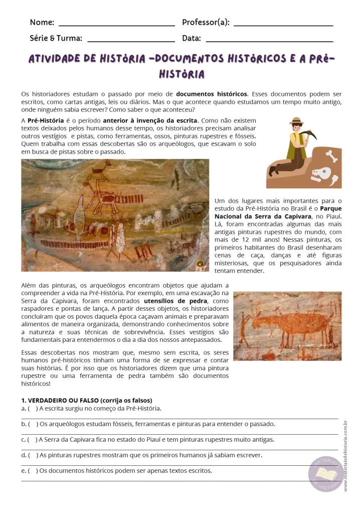 Resumo: Atividade sobre Documentos históricos e a Pré-História para 6º ano. Acompanha texto, exercícios e caça-palavras.