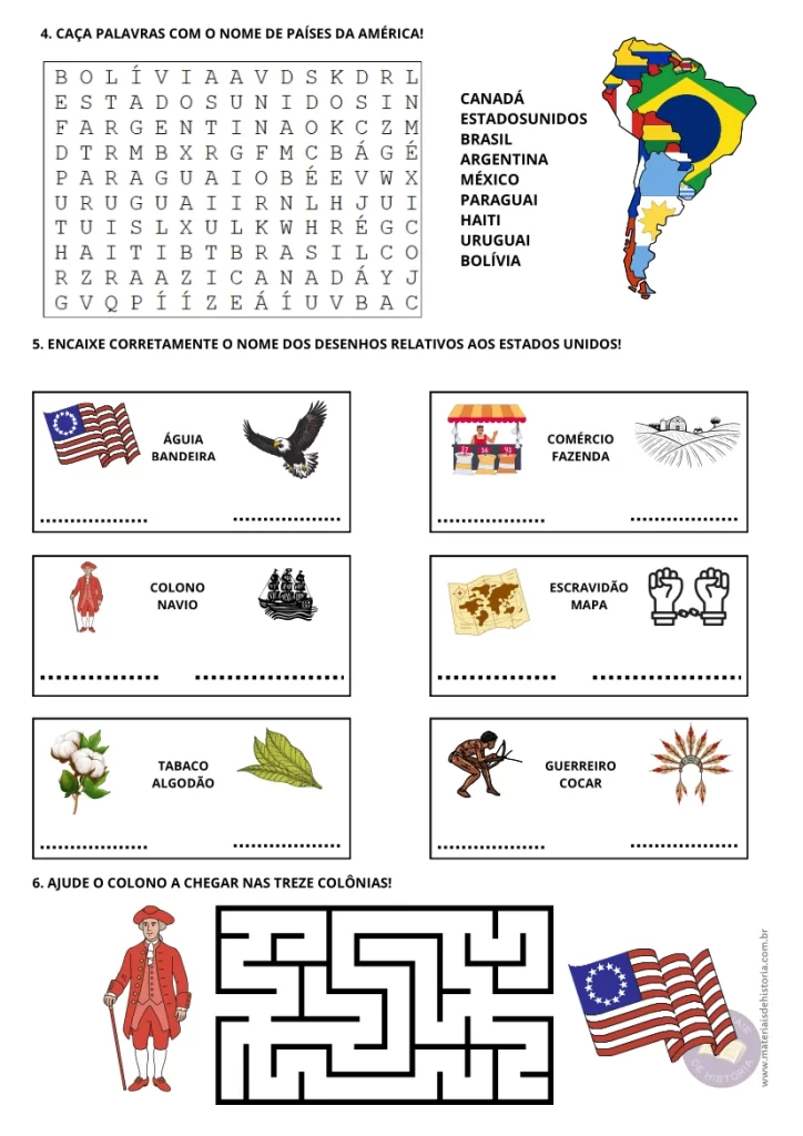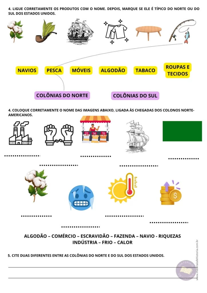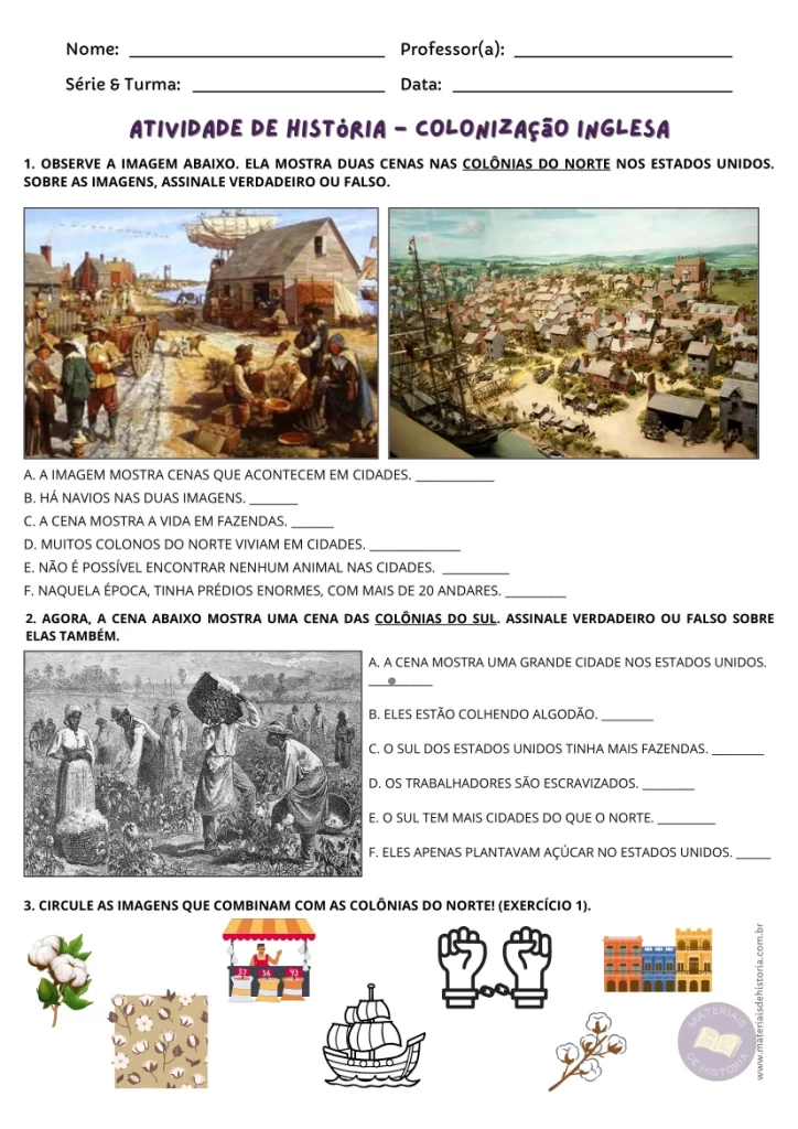 Resumo: Atividades Adaptadas sobre Colonização Inglesa dos Estados Unidos prontas para imprimir. Ideal para aplicação nos 7ºs anos com Alunos NEE (Educação Especial).